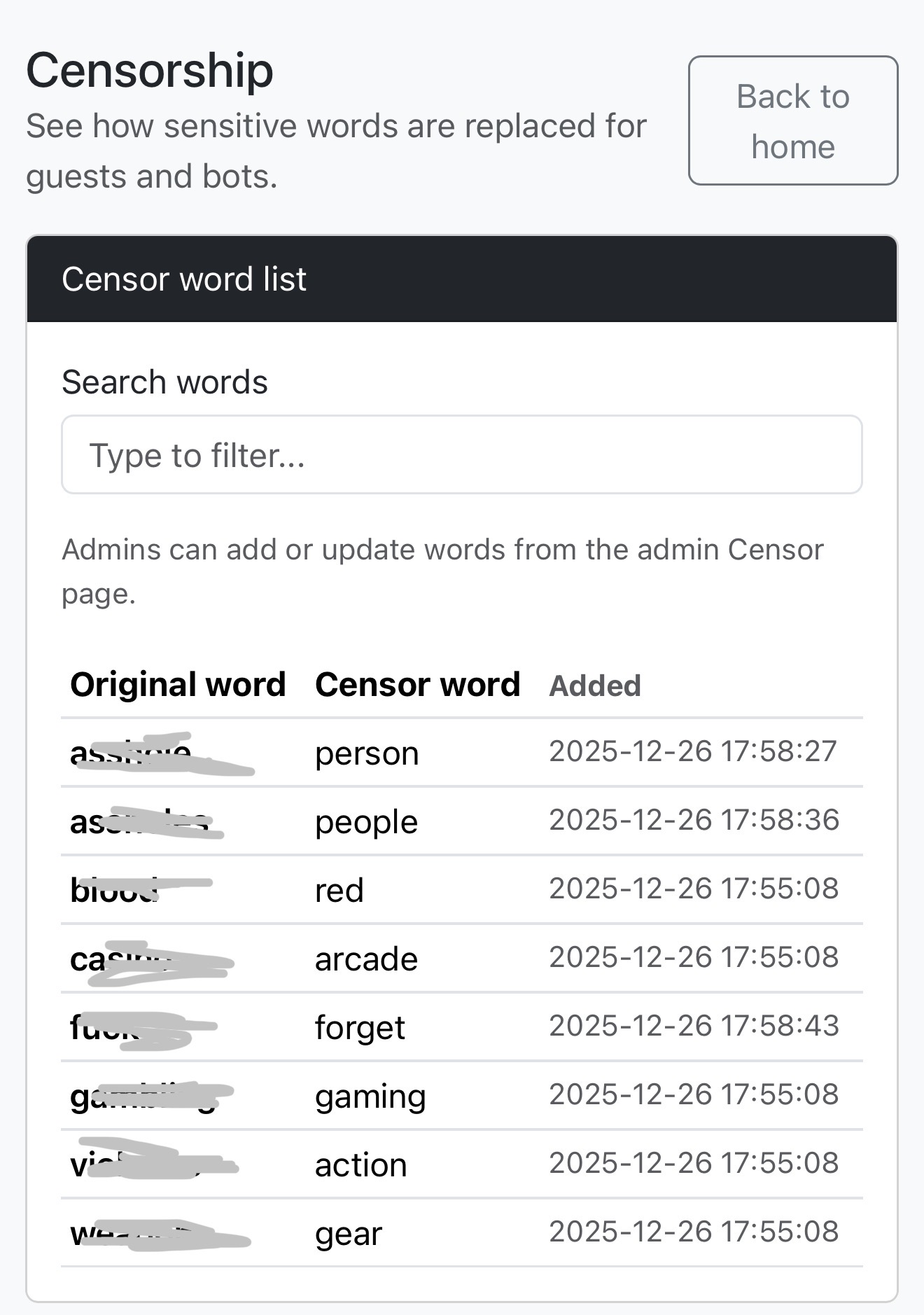 You can now see, and search through, the censorship list by visiting the nav bar and clicking Censorship!Mark new word pair suggestions in the comments below!