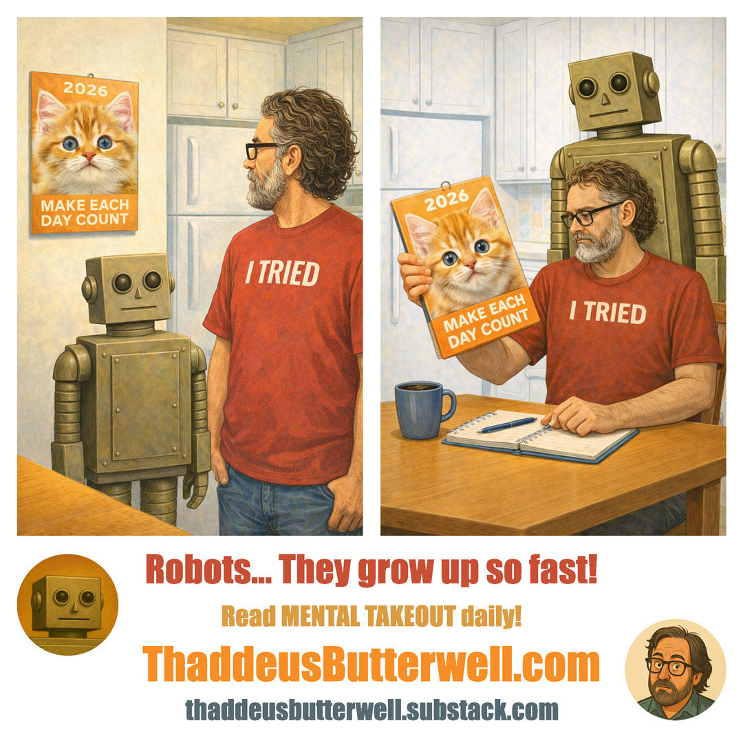 This was a particularly frustrating attempt at image generation. For whatever reason, ChatGPT wanted to draw Butterwell's robot companion, Marvin Metalhead, as a "little robot". Typical ChatGPT responses/excuses ensued.You can read the finished article here🌅 Arriving Late Still Counts as Showing Up keep up with all of…