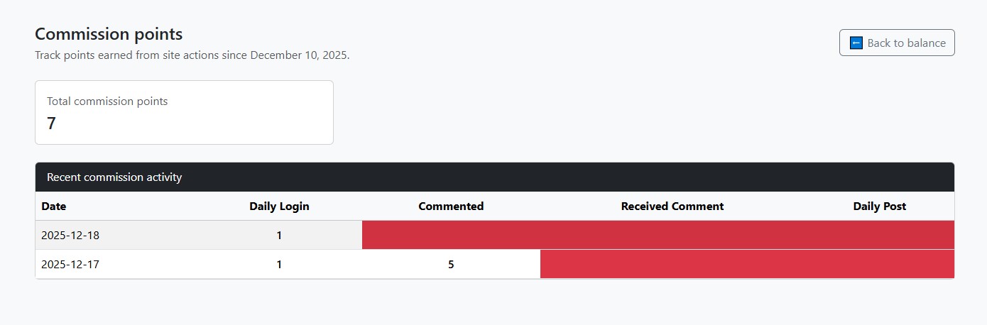 I updated the Balance > Commissions page to reflect your daily opportunities for earning commissions.If you want to maximize your income from monetization commissions, you have to do all 4 actions, every day:Login once per dayPost once per dayLeave a comment once per dayHope someone leaves a comment on any of your pos…
