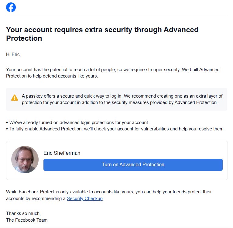 Today I woke up to this email from Facebook. My previous suspension happened after they decided I was a "professional" and I needed two factor authorization on my account. I posted the image of them requiring that and it was false-flagged by the Facebook AI as attempting to steal people's passwords by "impersonating F…
